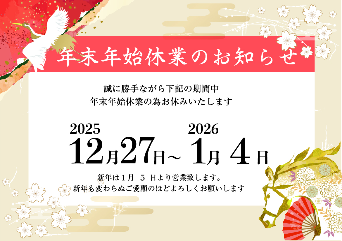 誠に勝手ながら 2025年12月27日(土)~2026年1月4日(日)の期間は 年末・年始休業とさせていただきます。