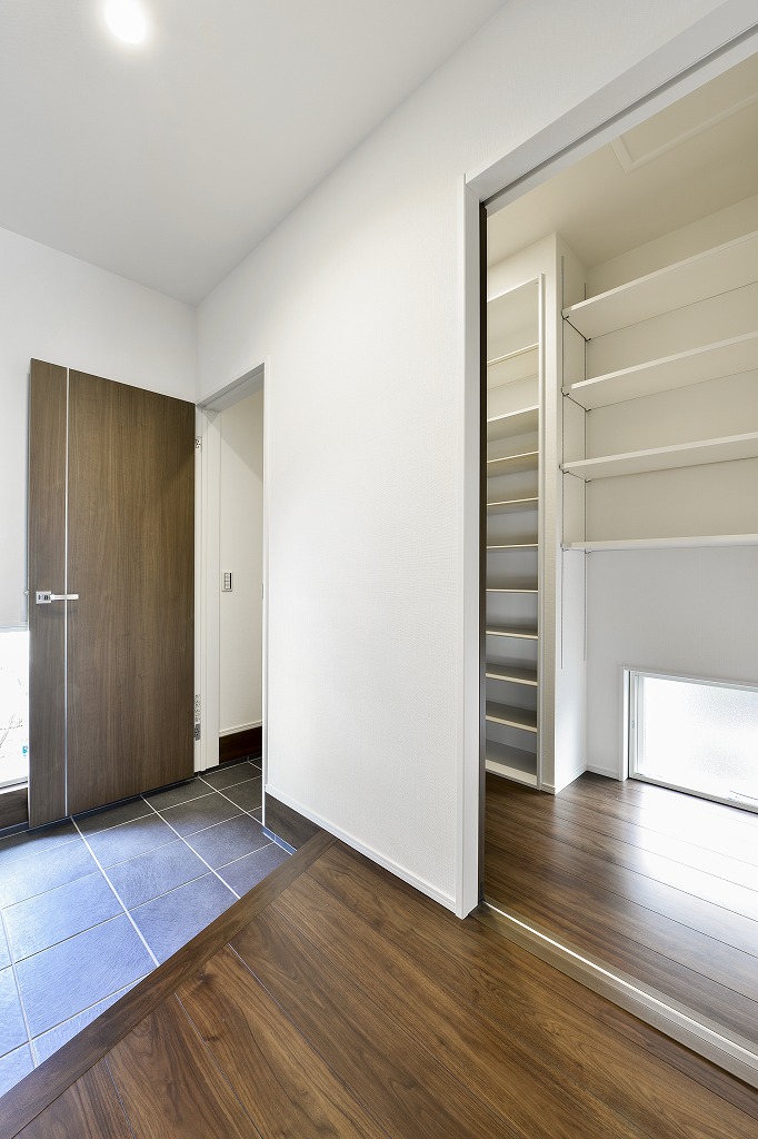 お出掛け、帰宅時の事を考えて、玄関にあるシューズクローゼットは2ウェイからのアクセス、シューズクローゼット内にも土間スペースを設ける等、スムーズ,スマートな動線を意識して設けました。