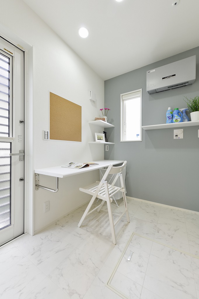 奥様目線の設計で、洗濯、アイロン掛け、家計簿を書いたりできる家事室を設けました。